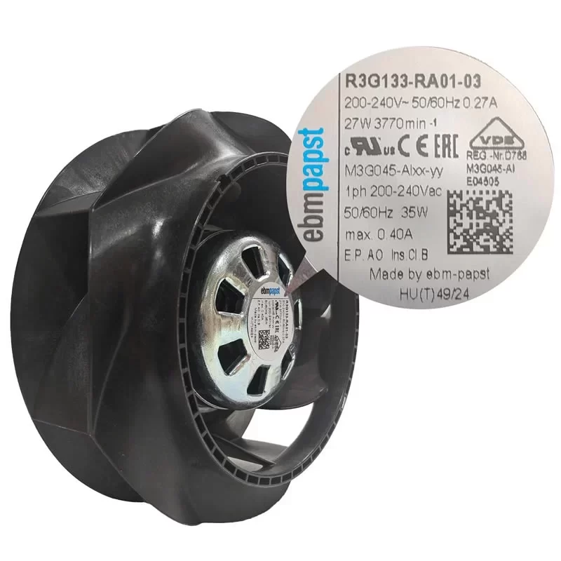 The ebmpapst R3G133-RA01-03 is a highly advanced RadiCal® EC centrifugal fan engineered for precision ventilation and intelligent airflow management. Powered by the M3G045-AI external rotor motor, this 133 mm backward-curved unit features integrated electronics that allow for direct 200-240 VAC input while providing superior energy efficiency and seamless speed control. The design incorporates a 7-blade PP plastic impeller and a thick-film passivated rotor surface, housed within a durable die-cast aluminum electronics casing. A key technical advantage is its comprehensive suite of electronic features, including a 10 VDC output, Tacho feedback, and a versatile 0-10 VDC/PWM control interface with SELV potential safely disconnected from the supply. Built for S1 continuous operation with IP54 protection, the R3G133-RA01-03 meets stringent EMC standards for both industrial interference immunity and household emission levels, making it the definitive choice for high-end medical devices and compact cleanroom filter units.