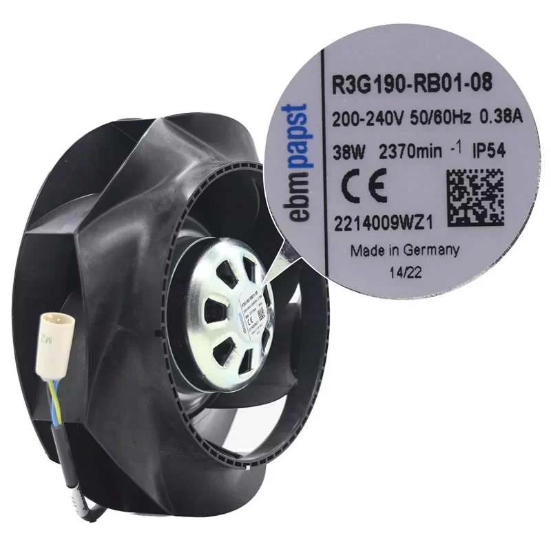 The ebmpapst R3G190-RB01-08 centrifugal fan is the primary cooling component for industrial frequency converters and modular HVAC systems requiring intelligent EC speed regulation and RadiCal® aerodynamic efficiency.
