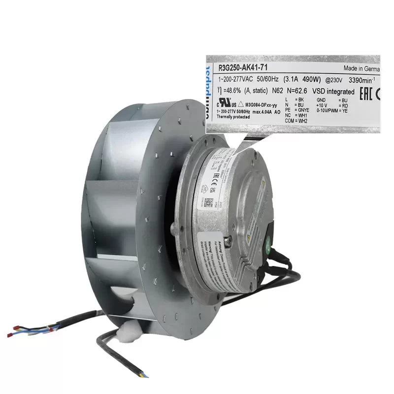 The ebmpapst R3G250-AK41-71 is a high-performance 200-277 V single-phase GreenTech EC centrifugal fan featuring a 250 mm backward-curved RadiCal impeller made of hot-dip galvanized sheet steel. Driven by the powerful M3G084-DF external rotor motor, this unit achieves a maximum airflow of 1055 m³/h and a high static pressure increase of 689 Pa. Designed for precision industrial cooling, it integrates an RS-485 interface (via 0-10V/PWM control), an alarm relay, and passive PFC for optimized power factor. With its IP54-rated die-cast aluminum electronics housing and 11-blade high-strength design, the R3G250-AK41-71 provides exceptional reliability, soft start-up, and adaptive speed control for demanding thermal management and ventilation applications across an ambient temperature range of -25 °C to 45 °C.