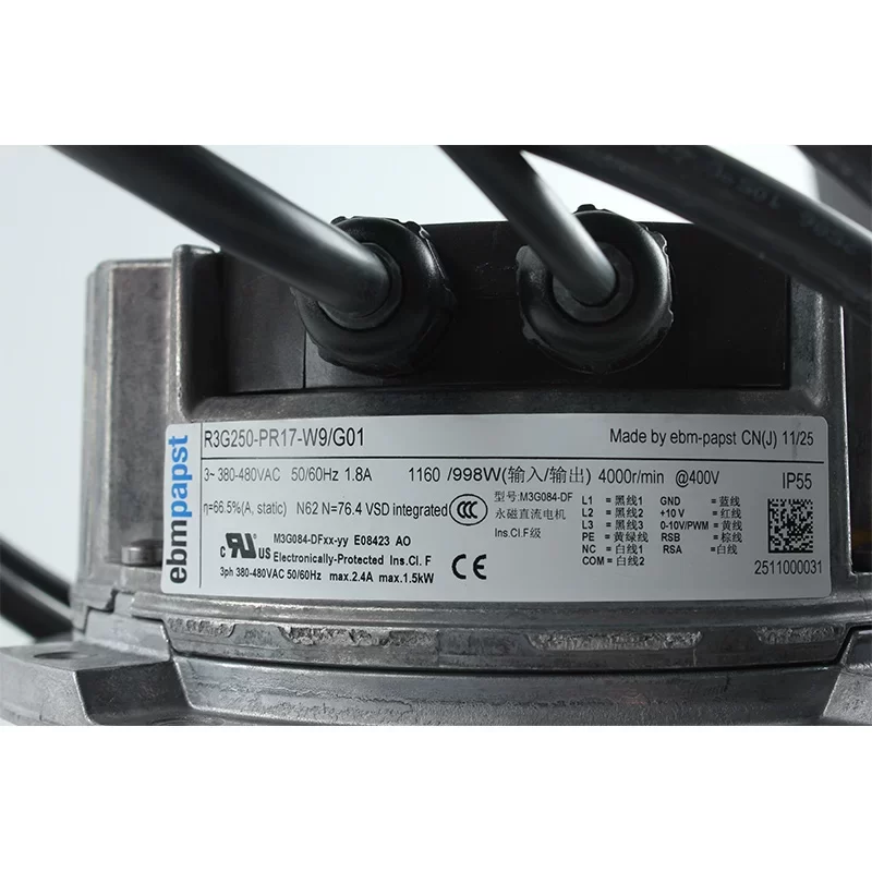 The ebmpapst R3G250-PR17-W9/G01 is a high-power 3-Phase EC Centrifugal Fan with an impeller size of 250 mm and dimensions of 250 x 123 mm. This backward-curved fan is part of the high-efficiency RadiCal series, driven by a powerful GreenTech EC external rotor motor. Operating on a 3-phase 380-480 VAC supply, it features a robust input power of 1160 W and an output power of 998 W. At its peak speed of 4000 RPM, it delivers a massive airflow of 1500.8 CFM (2550 m³/h). This model is specifically engineered for high-pressure industrial applications such as EC energy-saving retrofits in Fan Filter Units (FFU) and precision cooling systems. With integrated speed control, IP55 protection, and a glass-fiber reinforced composite impeller, it provides superior aerodynamic performance and long-term reliability in demanding cleanroom and industrial environments.