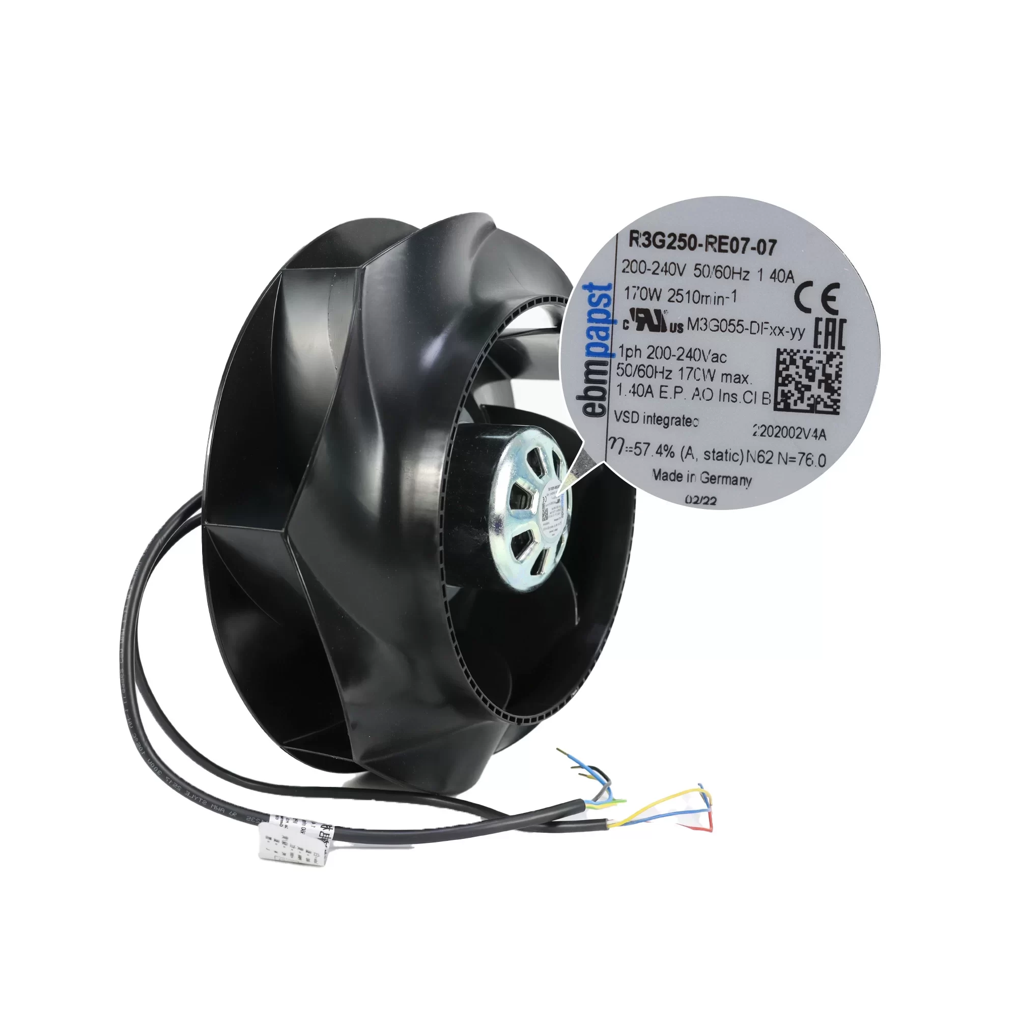 The R3G250-RE07-07 fan is optimally suited for complex air movement systems that require high static pressure capability and speed control. Its GreenTech EC technology makes it highly energy-efficient and ideal for applications such as Air Handling Units (AHUs), ventilation systems, fan filter units (FFUs) for cleanrooms, and other HVAC applications where continuous, variable speed operation and reliability are critical.