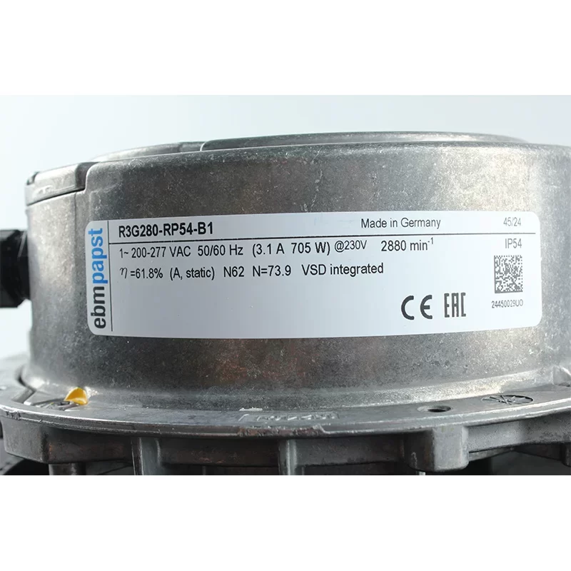 The ebmpapst R3G280-RP54-B1 is a high-performance EC Centrifugal Fan powered by the M3G084-FA motor, featuring a 280 mm backward-curved impeller designed for superior aerodynamic efficiency and pressure development. Operating on a 1-phase 230 VAC supply with an extended voltage range of 200 – 277 VAC, this unit consumes 705 W and draws 3.1 A to achieve a nominal speed of 2880 RPM. The fan is constructed with a 6-blade PP plastic impeller and a die-cast aluminum electronics housing, achieving an overall static efficiency of 61.8% in compliance with ErP 2015 standards. Weighing 5.3 kg and rated at IP54, the R3G280-RP54-B1 integrates advanced digital features including active PFC, RS-485 MODBUS-RTU, and a programmable control interface for 0-10V or 4-20mA sensors, making it an ideal intelligent thermal solution for high-static pressure applications in cleanrooms, server cooling, and industrial ventilation.