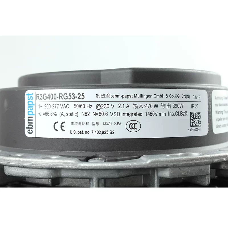 The ebmpapst R3G400-RG53-25 is a high-efficiency EC Centrifugal Fan with an impeller size of 400 mm and dimensions of 400 x 194 mm. Powered by the specialized M3G112-EA motor, this backward-curved fan is a key component of the aerodynamically optimized RadiCal series. Operating on a nominal 230 VAC with a wide input range of 200-277 VAC, it is rated at an input power of 470 W and an output power of 390 W. At its maximum speed of 1460 RPM, it delivers a high-volume airflow of 1836.4 CFM (3120 m³/h). Specifically engineered as an “EC Retrofit Solution” for Fan Filter Units (FFU) and cleanroom ventilation, it features integrated GreenTech EC technology with a glass-fiber reinforced composite impeller designed to minimize noise while maximizing static efficiency. Equipped with IP20 protection and a robust ball bearing system, it is the premier choice for upgrading cleanroom infrastructures to achieve intelligent, energy-saving performance.