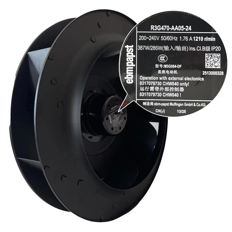 The ebmpapst R3G470-AA05-24 centrifugal fan is the primary cooling component for industrial frequency converters and air distribution systems requiring low-speed precision airflow and integration with external CHW035 series controllers.