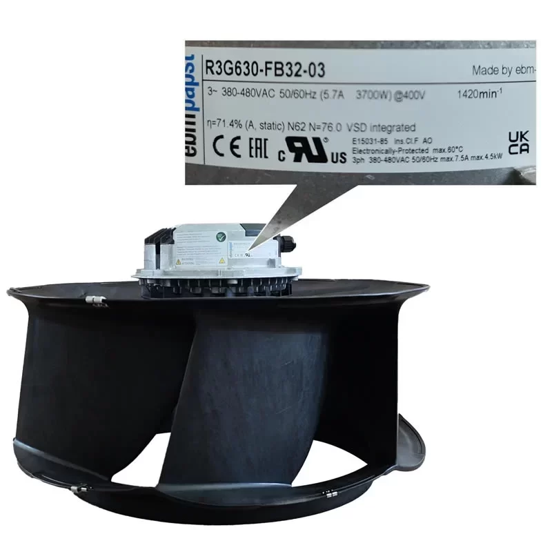 The ebmpapst R3G630-FB32-03 is a high-performance 400VAC EC Centrifugal Fan with dimensions of 660 x 660 x 405 mm, featuring a RadiPac backward-curved, single-intake impeller with a support bracket, specifically engineered for mission-critical cooling in Industrial Frequency Converters and large-scale air handling units. Driven by a 3-phase high-efficiency EC external rotor M3G150-IF motor with integrated electronics and maintenance-free ball bearings, this 28.6 kg unit operates on a 380 – 480 VAC supply delivering a Max. Power Consumption of 3700 W and a Max. Current Draw of 5.7 A at a rated speed of 1420 RPM. This High-performance unit achieves a Max. Air Flow of 7466.1 CFM (12685.0 m³/h / 211.42 m³/min) and a Max. Static Pressure of 72.50 mmH₂O (711.0 Pa / 2.85 inAq). Featuring intelligent speed regulation via 0-10V/PWM and RS-485 MODBUS-RTU (V6.3), integrated PI controller, and passive PFC, this 6-blade unit with PP plastic construction is optimized for industrial VFD systems requiring advanced motor protection and massive airflow in a black-painted rotor design at the end.