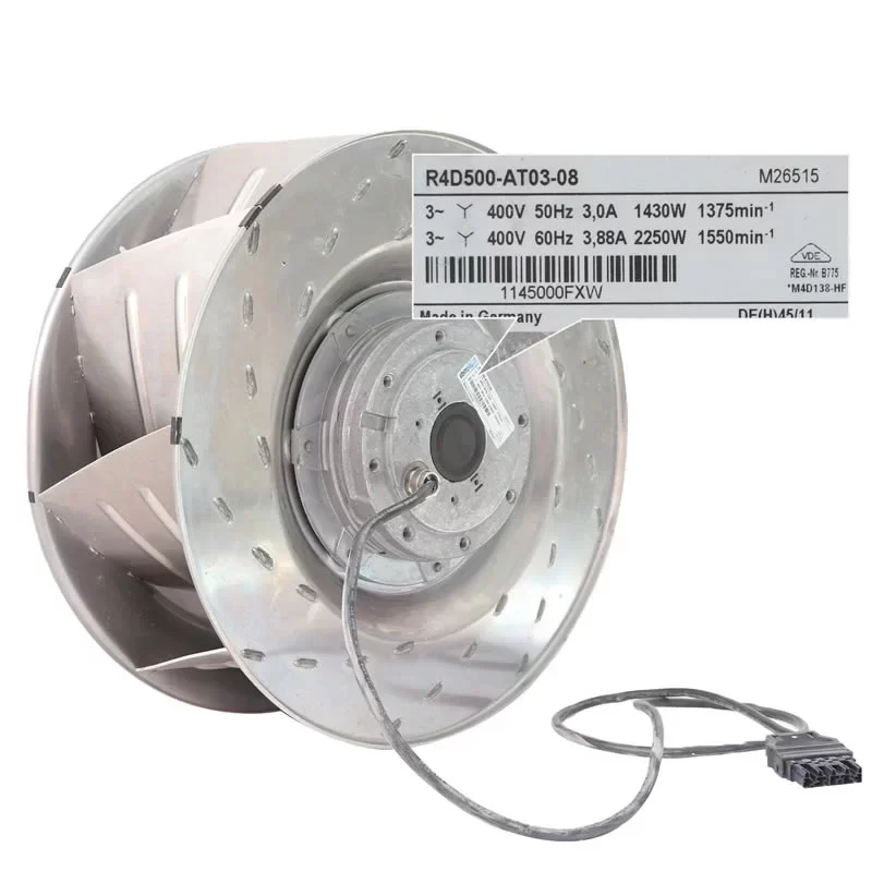 The ebmpapst R4D500-AT03-08 is a high-performance 400VAC AC Centrifugal Fan featuring a backward-curved, single-intake impeller, specifically engineered for mission-critical cooling in Industrial Frequency Converters and large-scale ventilation systems. Driven by a 3-phase 4-pole M4D138-HF external rotor motor with maintenance-free ball bearings, this 22.3 kg unit operates on a 400 VAC supply delivering a Max. Power Consumption of 1430 / 2250 W and a Max. Current Draw of 3.0 / 3.88 A at a rated speed of 1375 / 1550 RPM. This High-performance unit achieves a Max. Air Flow of 4414.3 / 4944.1 CFM (7500.0 / 8400.0 m³/h / 125.00 / 140.00 m³/min) and a Max. Static Pressure of 54.04 / 68.32 mmH₂O (530.0 / 670.0 Pa / 2.13 / 2.74 inAq). Featuring integrated thermal overload protection and Class F insulation, this 9-blade unit with sheet aluminum construction is optimized for industrial VFD systems requiring massive airflow and robust static pressure in any installation position at the end.
