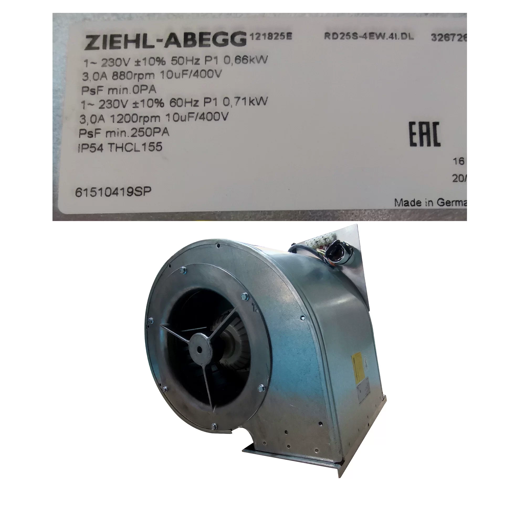 The ZIEHL-ABEGG RD25S-4EW.4I.DL is a high-performance 230VAC single-phase AC Centrifugal Blower with dual 250 mm forward-curved impellers integrated into a heavy-duty double-inlet scroll housing, specifically engineered for mission-critical cooling in Industrial Frequency Converters and specialized AHU systems. Driven by a high-torque external rotor motor with precision ball bearings, this 14.5 kg unit operates within a 230VAC range across 50/60 Hz frequencies, delivering a Max. Power Consumption of 0.66 / 0.71 kW and a Max. Current Draw of 3.00 / 3.00 A at a rated speed of 880 / 1200 RPM. This High-performance unit features a specialized dual-impeller design within a galvanized steel housing achieving a Max. Air Flow of 2650.0 / 3150.0 m³/h (1559.7 / 1854.0 CFM / 44.17 / 52.50 m³/min) and a Max. Static Pressure of 35.69 / 48.95 mmH₂O (350.0 / 480.0 Pa / 1.41 / 1.93 inAq). Featuring a “Made in Germany” robust construction with integrated thermal contacts (TB) for motor protection and a critical Min. Static Pressure requirement (PsF min. 250 Pa) at 60 Hz to prevent motor overload, this IP54-rated blower is optimized for environments requiring high-volume airflow and high-pressure stability in industrial VFD systems at the end.