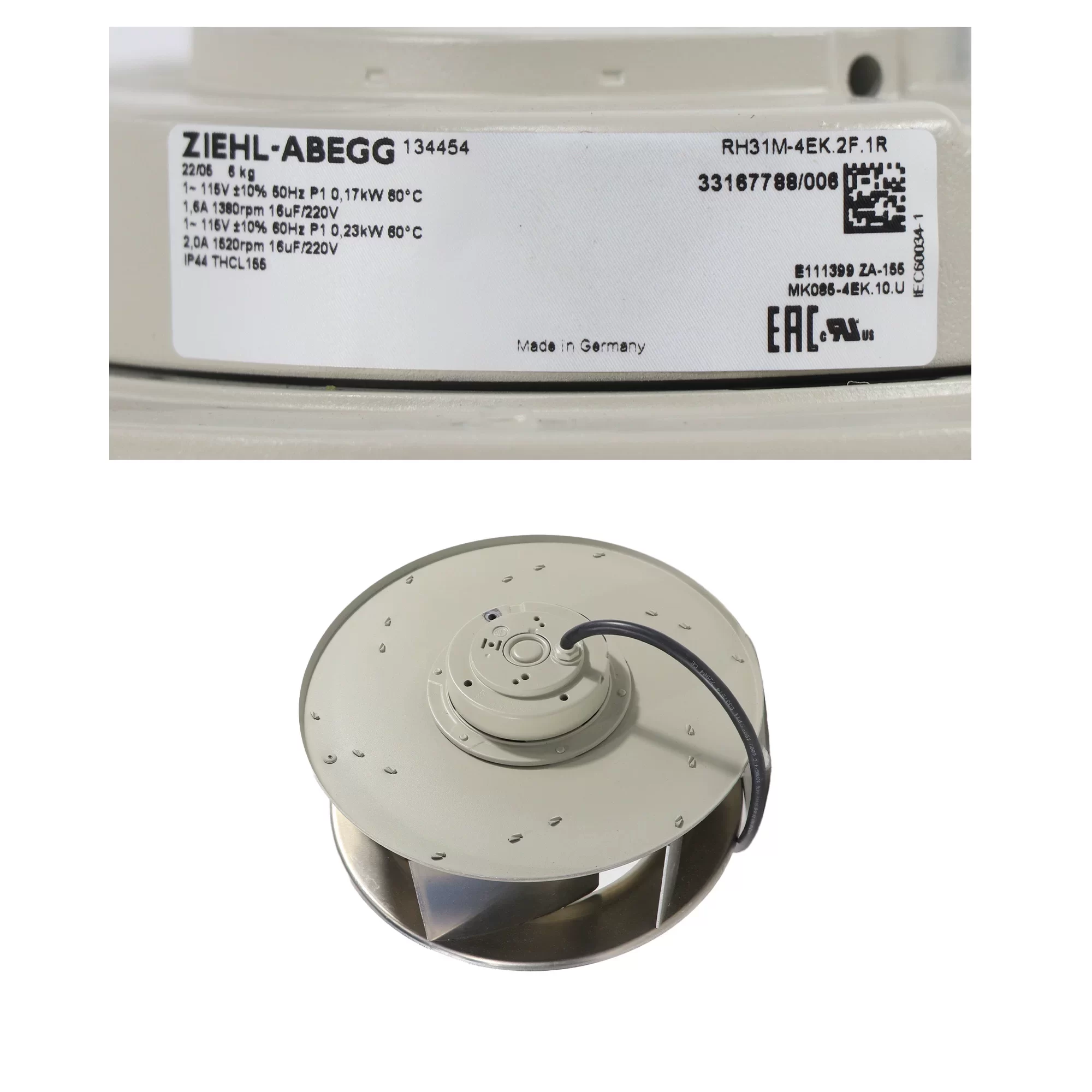 The ZIEHL-ABEGG RH31M-4EK.2F.1R is a high-performance 115VAC AC Centrifugal Fan with a 310 mm backward-curved aluminum impeller, specifically engineered for mission-critical cooling in Industrial Frequency Converters and specialized AHU systems. Driven by a high-torque MK085-4EK.10.U external rotor motor with precision ball bearings, this 6.0 kg unit operates within a 115VAC range across 50/60 Hz frequencies, delivering a Max. Power Consumption of 170.0 / 230.0 W and a Max. Current Draw of 1.60 / 2.00 A at a rated speed of 1380 / 1520 RPM. This High-performance unit features a specialized aerodynamic 7-blade aluminum impeller achieving a Max. Air Flow of 1980.0 / 2180.0 m³/h (1165.4 / 1283.1 CFM / 33.00 / 36.33 m³/min) and a Max. Static Pressure of 33.14 / 40.79 mmH₂O (325.0 / 400.0 Pa / 1.31 / 1.61 inAq). Featuring a heavy-duty design with integrated thermal contacts (TB) for motor protection, this IP44-rated fan is optimized for environments requiring extreme heat resistance up to 80 °C and high-pressure stability in industrial VFD and power electronics systems at the end.