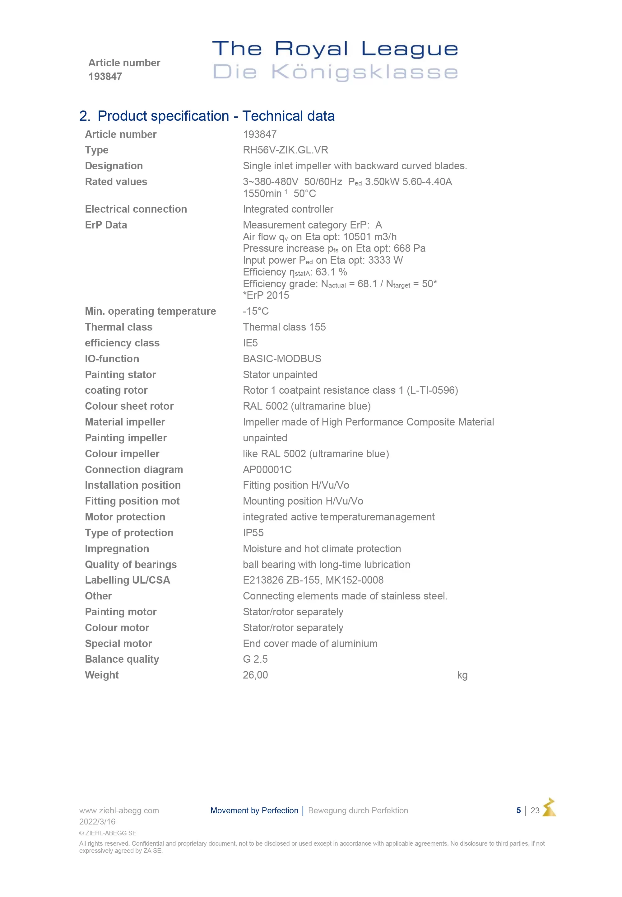 The Ziehl-Abegg RH56V-ZIK.GL.VR (Article No. 193847) is an ultra-high-efficiency 3-phase EC Centrifugal Fan module featuring a 560 mm ZAbluefin backward-curved impeller. Built with High Performance Composite Material, the impeller and rotor are finished in striking RAL 5002 ultramarine blue. Driven by the MK152-0008 motor with an integrated BASIC-MODBUS controller, this 26.00 kg unit operates on a wide 380-480 VAC supply, delivering 3.50 kW of power and a maximum airflow of 10501 m³/h at its optimum efficiency point. It meets IE5 efficiency standards with an efficiency grade of Nactual 68.1 and features integrated active temperature management for mission-critical reliability. Optimized for premium AHUs and FanGrid systems, the RH56V-ZIK.GL.VR offers IP55 protection and superior acoustic performance in temperatures as low as -15 °C.