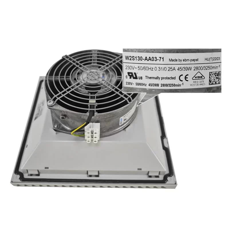 The Rittal SK3325.107 is a high-performance 230VAC Fan-and-filter unit with external dimensions of 255 x 255 x 105 mm, featuring an integrated ebmpapst shaded pole motor specifically engineered for mission-critical cooling in Industrial Frequency Converters and TopTherm enclosure systems. Driven by a precision-balanced motor with maintenance-free ball bearings and moisture protection, this 1.95 kg unit operates at 230 VAC / 50/60 Hz delivering a Max. Power Consumption of 41.0 / 38.0 W and a Max. Current Draw of 0.28 / 0.24 A. This High-performance unit achieves an unimpeded Air Flow of 230.0 / 265.0 m³/h (135.4 / 156.0 CFM / 3.83 / 4.42 m³/min) and a Max. Static Pressure of 16.32 / 19.37 mmH₂O (160.0 / 190.0 Pa / 0.64 / 0.76 inAq). Featuring a tool-free mounting system and a robust RAL 7035 ABS plastic housing, this IP54-rated unit is optimized for environments requiring high reliability and filtered laminar airflow in industrial VFD systems at the end.