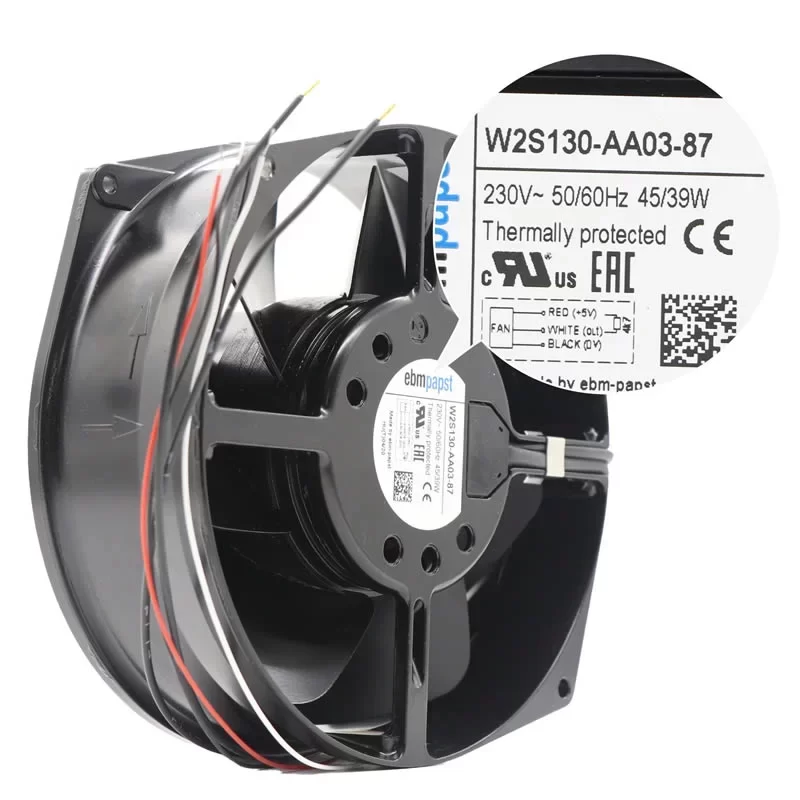 The ebmpapst W2S130-AA03-87 is a high-performance 1~ AC Axial Fan featuring a robust die-cast aluminum housing with dimensions of 172 x 150 x 55 mm. Operating at a nominal 230 VAC (50/60 Hz), this unit is powered by the M2S052-CA motor and utilizes a 7-blade impeller made of black-painted sheet steel. At 50 Hz, it achieves a rated speed of 2800 RPM with 45 W power consumption, while at 60 Hz it reaches 3250 RPM at 39 W. A key technical feature of this model is the integrated Hall IC for speed monitoring, providing critical feedback for system diagnostics. Designed for S1 continuous duty, the fan is equipped with maintenance-free ball bearings and an internally connected thermal overload protector. With an IP20 rating and “V” airflow direction (exhaust over struts), the W2S130-AA03-87 is an ideal cooling solution for medical equipment, industrial cabinets, and precision electronics.