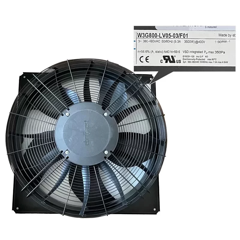 The ebmpapst W3G800-LV05-03/F01 is a high-capacity industrial EC axial fan with a nominal voltage of 400 VAC and dimensions of 970 x 970 x 350 mm, specifically engineered for large-scale air handling units and industrial cooling applications requiring high static pressure. Driven by a high-torque M3G150-NA GreenTech EC external rotor motor with a maximum power consumption of 3500 W and a current draw of 5.3 A, this unit features a heavy-duty dual ball bearing system designed for long-term mechanical stability and continuous S1 duty. Its advanced aerodynamic design, incorporating PP plastic guide vanes and an internal diffuser, delivers a powerful balance of massive airflow and high back pressure up to 350 Pa, making it highly effective at maintaining air circulation in industrial halls and commercial HVAC systems. Constructed with a galvanized and black plastic-coated sheet steel housing and a die-cast aluminum electronics enclosure, this 51.4 kg fan provides a dependable and energy-saving cooling solution with integrated Modbus-RTU interface and thermal overload protection for data centers and large-scale infrastructure at the end.