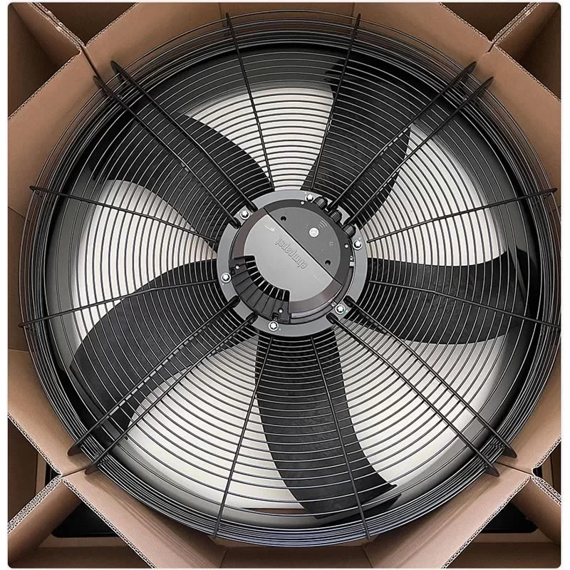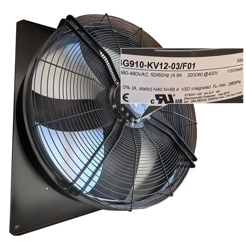The ebmpapst W3G910-KV12-03/F01 is a heavy-duty industrial EC axial fan with a nominal voltage of 400 VAC and dimensions of 1070 x 1070 x 338 mm, specifically engineered for large-scale ventilation and air handling units with limited installation depth. Driven by a high-efficiency M3G150-NA GreenTech EC external rotor motor with a power consumption of 3200 W and a current draw of 4.9 A, this unit features a robust dual ball bearing system designed for continuous S1 duty in demanding environments. Its aerodynamic design with a 910 mm impeller delivers a massive airflow of 25680 m³/h at its optimum efficiency point, making it highly effective at maintaining air circulation in industrial halls and commercial HVAC systems. Constructed with a galvanized and black plastic-coated sheet steel housing and a die-cast aluminum electronics enclosure, this 54 kg fan provides a dependable and energy-saving cooling solution with integrated Modbus-RTU interface and thermal overload protection for data centers and large-scale infrastructure at the end.