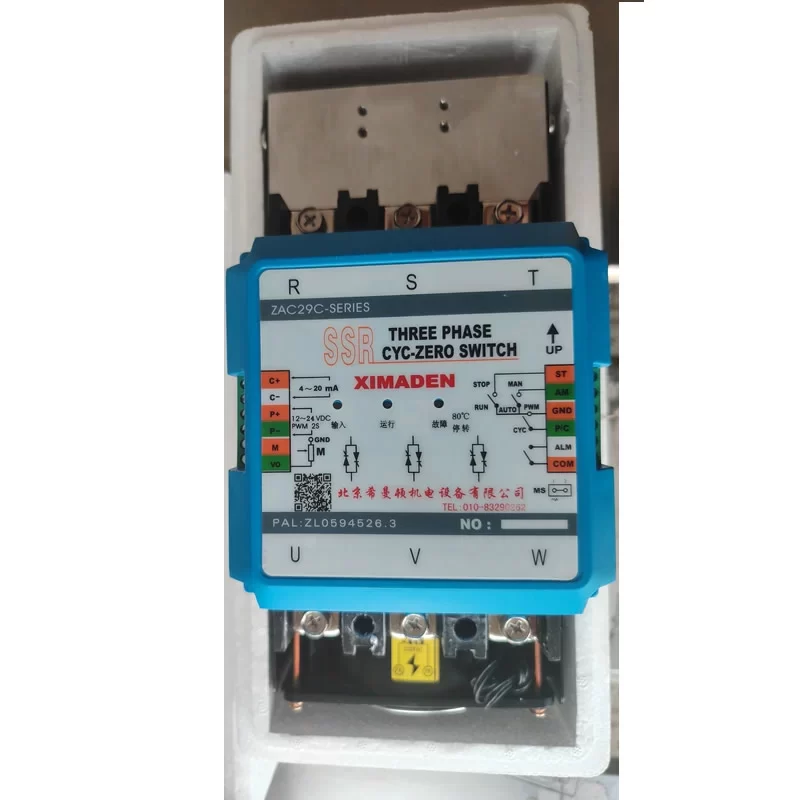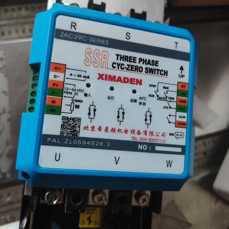 ZAC29C-3P3-120A+KR is part of XIMADEN’s ZAC29C series and is a widely used three-phase zero-cross cycle power controller designed for industrial electric-heating applications. It supports both 4–20 mA and PWM inputs, with PWM or CYC (cycle) output modes. The unit features a European-style safety dust-proof structure and multi-color LED indicators (red, blue, green) for clear working-status display.